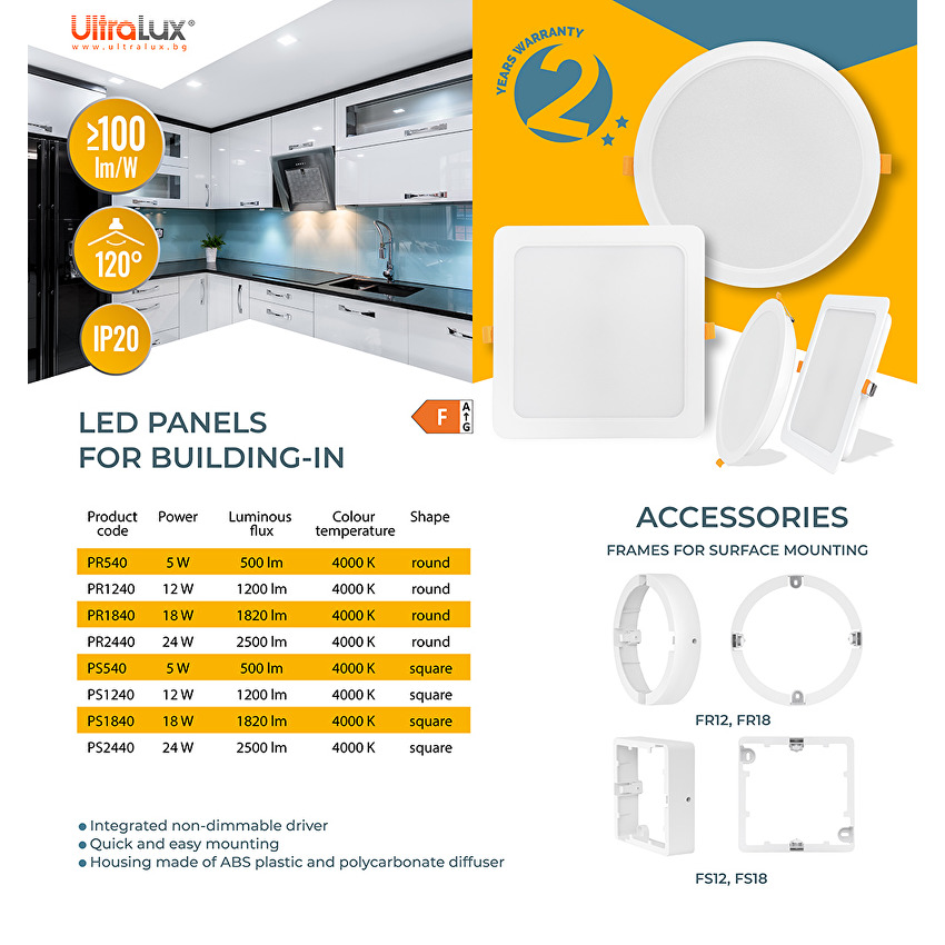 Panou LED, încastrabil, rotund, 12W, 4000K (lumină neutră) Ultralux cu următoarele avantaje: Tipul constructiv ajută la obținerea unei eficiențe energetice ridicate – 105 lm/W. PCB-ul are un driver integrat, nedimabil, garantând o perioadă lungă de funcționare. Montare rapidă și ușoară prin încastrare sau prin ramă pentru montare aparentă. Carcasă din plastic ABS și difuzor din policarbonat, asigurând o rezistență mecanică și o disipare a căldurii mai bune. Unghi de fascicul larg – 120°, potrivit pentru iluminat general. Gama de panouri LED încastrabile este formată din 11 modele rotunde și pătrate. Patru dintre acestea sunt oferite în temperatură de culoare neutră (4000K) și, respectiv, putere de 5W – PR540, 12W – PR1240, 18W – PR1840 și 24W – PR2440. Modelele PRW5CCT, PR12CCT, PR18CCT au formă rotundă și, respectiv, o putere de 5W – PRW5CCT, 12W – PR12CCT, 18W – PR18CCT și opțiune de alegere a temperaturii de culoare (3000/4000/6500K). Panoul PRW5CCT are un grad de protecție mai mare (IP54). Modelele pătrate sunt oferite la 4000K și cu o putere de 5W – PS540, 12W – PS1240, 18W – PS1840, 24W – PS2440.