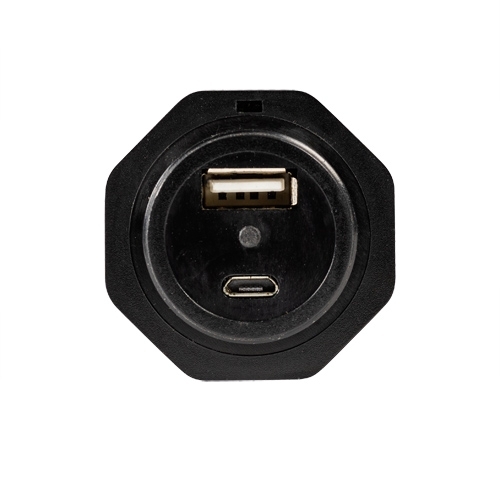 - Lampa este prevăzută cu două porturi, amplasate sub butonul de comutare a modurilor și protejate printr-un capac: un port Micro USB de intrare pentru încărcarea bateriei integrate și un port USB de ieșire pentru încărcarea altor dispozitive.