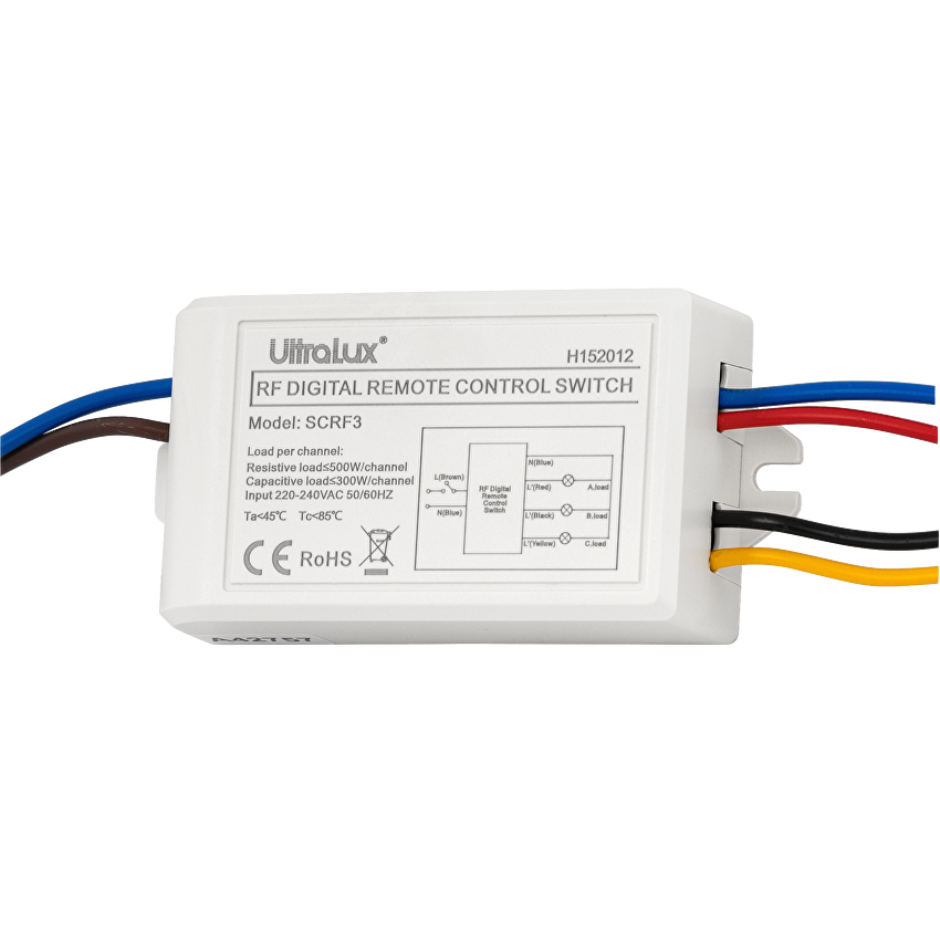 TIP: RF Frecvență: 2,4 GHz Sarcină pe canal: ≤500 W - sarcină activă (lampă incandescentă); ≤300 W - sarcină capacitivă (lămpi CFL și LED) Rata IP: IP20 Dimensiuni receptor: 101/48/25 mm Dimensiuni telecomandă: 140/20/19 mm Distanta de lucru: până la 30 m (în zona deschisă) Tensiune de lucru: 2 baterii (incluse) Suport pentru montare pe perete